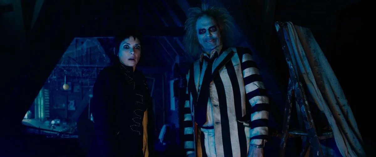 There's also a love story, kind of, between Astrid and a local boy (Arthur Conti of "House of the Dragon") who invites her for a date on Halloween night and correctly notes that she's dressed as scientist Marie Curie after she'd begun to die of radiation poisoning. The teen romance sections of "Beetlejuice Beetlejuice" are retro-'80s Burton par excellence, evoking the intoxicating sensations of youthful attraction, driven by banter, music, and shared stories. There could've been more of this stuff. It's so terrific (thanks to Conti and Ortega's note-perfect performances, but also the way Burton stages and frames their interactions) that it could've been the centerpiece of a whole other film.
