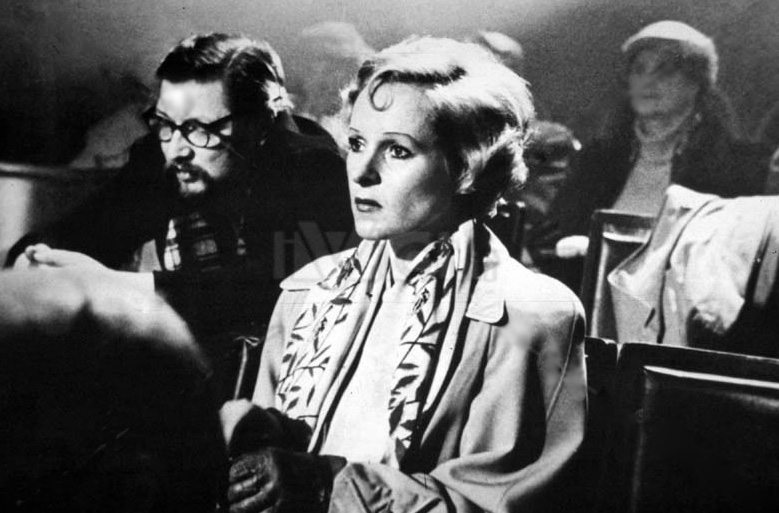 The film opens in 1955 with Voss (Rosel Zech) looking at one of her own pre-war classics (that's Fassbinder himself in the audience, leaning on the seat-back behind her). There was a time when she was welcomed in the offices of producers, greeted by headwaiters, recognized on the street. That time has passed, and it is painful to hear her remind people who she is — or was. One night, drinking without funds in a cabaret, she falls into conversation with a soft-faced sportswriter named Robert Krohn (Hilmar Thate), who is old enough to remain under her spell. She grandly says she will pick up the check, then "allows" him to do it, and invites him to come home with her. All the furniture in her villa is covered in white sheets, the electricity is disconnected, and she has them light candles "because they are so much more flattering to a woman." The star struck journalist has without realizing it walked into the last act of Veronika Voss's life.