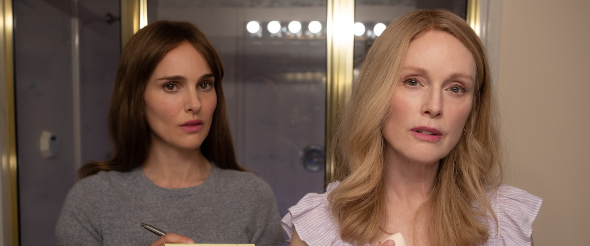 "May December" starts with a flurry of confusing activity in two different locations. A glamorous woman (Natalie Portman) checks into a boutique hotel, murmuring into her Bluetooth. Another woman (Julianne Moore) is in the final stages of planning a get-together at her waterfront home. She opens the fridge and stares into it. The camera then pushes in on her face as the music surges alarmingly. The effect is so dramatic you would not be surprised if a severed head was inside the refrigerator. This is the first real announcement of what the movie will be doing and how it will be doing it. To no one in particular, the woman says flatly, "I don't think we have enough hot dogs."